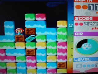 Another puzzle game, Namco's Mr Driller is something of a diversion from Soul Calibur - and then some. Basically, you play a super-deformed miner who has to dig down a shaft full of garishly coloured blocks. Dig under other blocks and they'll collapse on top of you and smash your pathetic body to a pulp. You also have to collect air tanks in order to stay alive the deeper you go into the crust. Again, my description leaves a lot to be desired, but it's really simple once you get the hang of it, and knowing which blocks to 'drill' becomes a test of strategy...dig in the wrong place and you'll get crushed by the subsequently falling ceiling. As the box-guff says, it takes a few minutes to learn how to play, but it'll take you bastarding ages to master, old chum (sic).