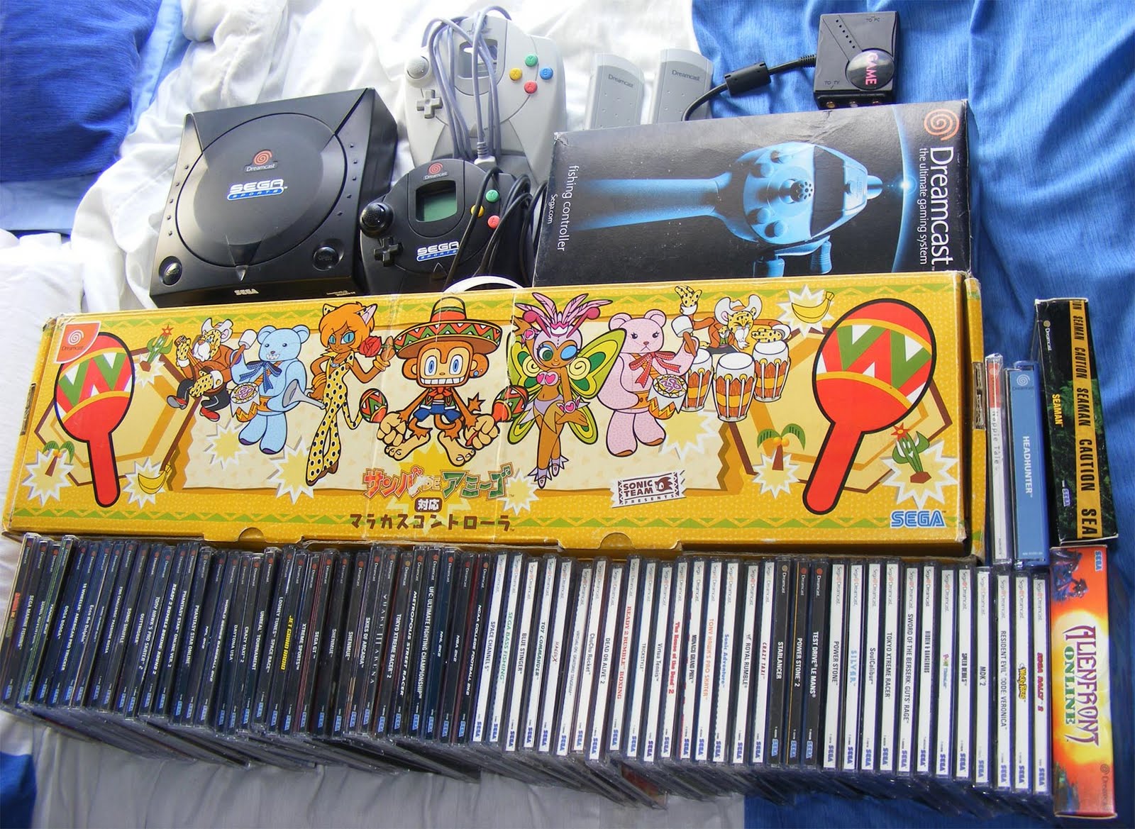 So yeah, I've spent rather a big chunk of money on this large bundle of Dreamcast stuff you see above you. For reference there is 70 games amongst it (68 American, 1 PAL and 1 Japanese), two controllers, two VMUs, two rumble packs, a VGA box, two microphones (bundled with Seaman and Alien Front), a fishing controller and Samba De Amigo Maracas. To be fair I'm not keeping everything you see here: whenever I buy bundles I end up selling whatever I don't want out of it to make some of (or if I'm lucky sometimes all) the money back Obviously there are plenty of games here I already own, and in some cases I will be replacing my chunky PAL games with these much slimmer-on-the-shelf American versions.