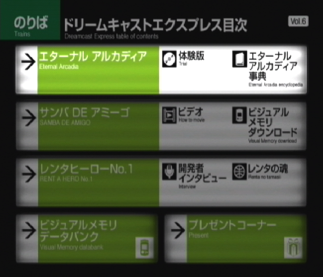 Volume 6 differs slightly from the other in the series in that it is the first one to offer a different interface. The rotating cube and omnipresent Candy and Dandy are gone, to be replaced with a much more subtle menu system from which you choose your demos and movies. Also different is the way that disc 1 contains demos and movies, while disc 2 is called 'special disc' and has another totally different interface, looking more like a train station departures board. Playable demos include Super Runabout and Aero Dancing (again) and the movies include Ecco, Phantasy Star Online and Metropolis Street Racer. This is particularly interesting considering MSR wasn't given an official release in Japan.