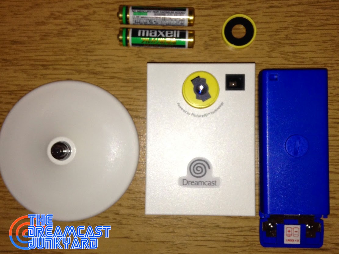 The second thing that hit me after unboxing the Dreameye (apart from being pleasantly surprised that the box includes a set of LR03 batteries) was just how small the camera is. It essentially comes in several parts: the main camera body, the battery compartment (which probably also houses the storage device), the lens cover (which is removable if you twist it) and the weighted base. Here's how it measures up next to a VMU: