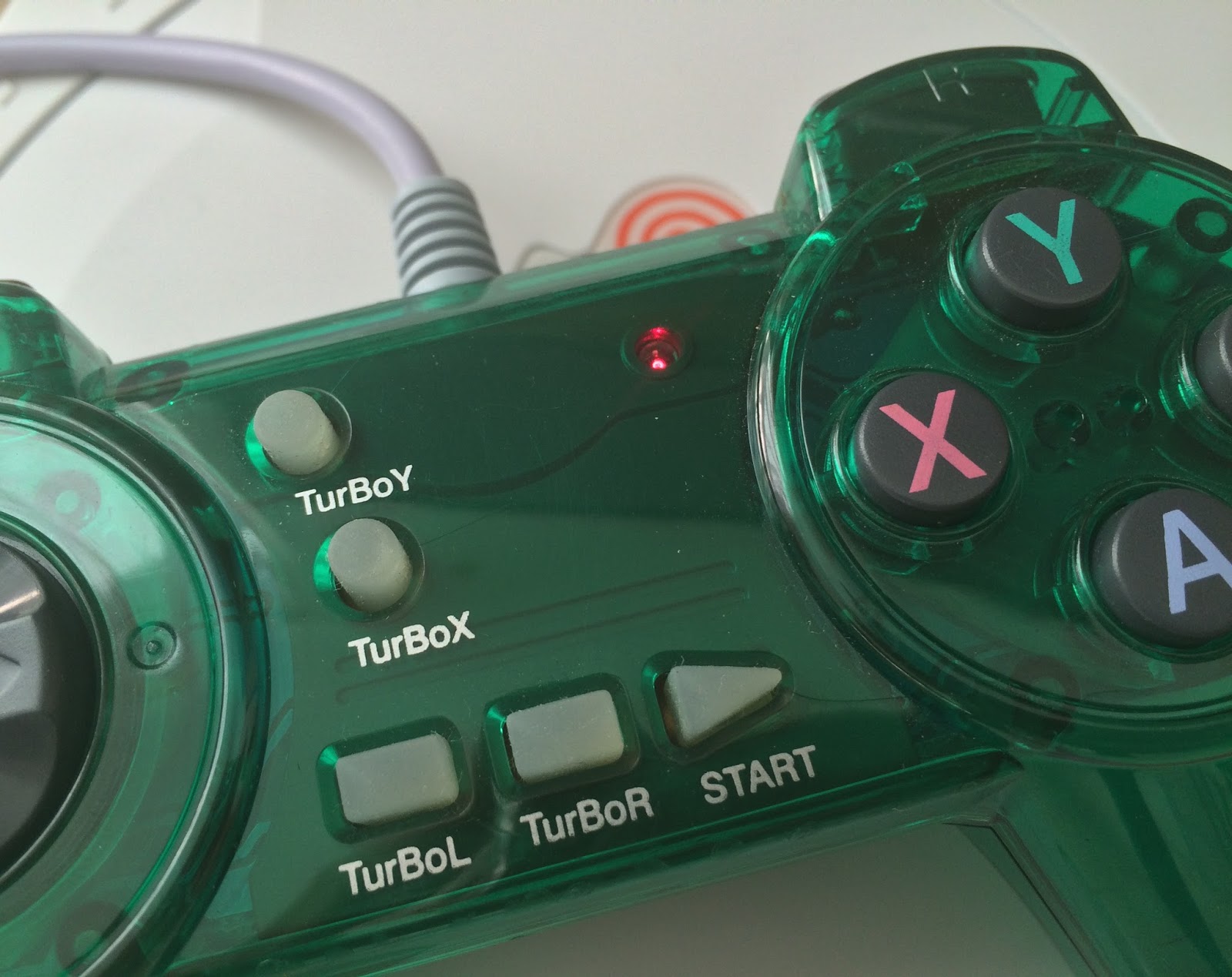 First though, lets look at the bad things. For starters, there's no analogue stick here. If the R&D team (ha!) at XG - the manufacturer - had really thought about what they were doing, they could have modelled the pad after the Dual Shock and brought the world a dual analogue Dreamcast pad. Instead, they just knocked off the moulds for the original PS1 controller, left out any mention of analogue control (including the triggers), ignored the VMU slot and just placed a PCB inside a translucent case and added a couple of turbo buttons. Oh, and put a red LED in for good measure. Indeed, as with some other official peripherals, you must plug a VMU into a device in slot B in order to save and load your data. No biggie, but if the Treamcast mouse could have a handy VMU slot on the end of the wire, why couldn't this? And those stupidly expensive Ascii pads have VMU ports too, for that matter. It's a minor gripe, but we like to be thorough (nerdy) here at the 'Yard.