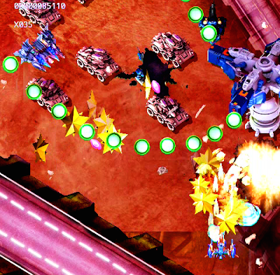 On the face of it, Ghost Blade will probably appear to many gamers like a fairly straight-forward retro-style vertically-scrolling shmup. Enemies appear either from the top, side or bottom of the screen and spew brightly coloured bullets which you must dodge. And this assumption would be accurate, to a point. In Novice mode, being hit by a rogue projectile will instantly fire a bomb which will save your skin as long as you have them in reserve. In Normal mode you won't be so lucky. It quickly becomes a game of balancing using your normal spread shot and then using your focus shot in order to harvest tech orbs to replenish your bombs...but on top of that you need to be aware of the combo counter which is always adding up how many enemies you have vanquished with a single life. If you want to get a decent score, this is the key - once you lose a life your combo is reset to zero and you have to start the chain again. And this is important, as Ghost Blade is a relatively short game with it's 5 stages and it soon becomes apparent that it's not about beating the game in the quickest possible time, it's actually about getting the biggest combo possible.
