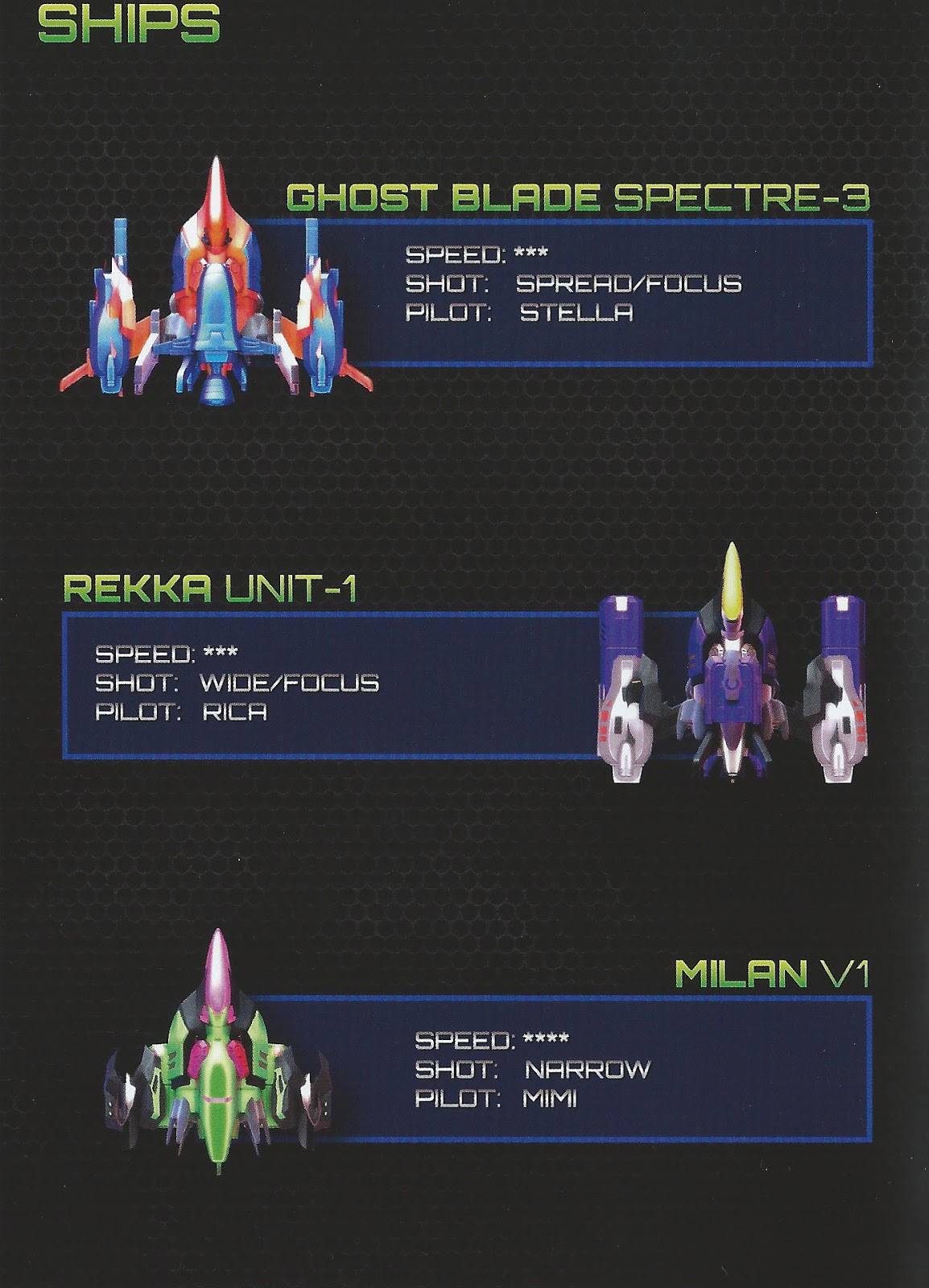 | The three different ships you have to choose from. Speed, shot type and handling skill vary. |