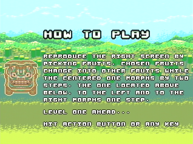On the right side of the screen you will see an arrangement of fruits. On the left you will see an another, slightly different arrangement. In the column separating the two halves of the play area you'll see a sequence of fruits (and Sheran jumping around on a little pedestal like the self-important brat he is). The point of this central column of fruits is that it represents the sequence of transformation that the fruits on the board will 'travel' in once you select them. The one you select changes into the one two fruits down, the ones on the right, left, above and below change once. All you have to do is match the pattern on the right hand screen and then you move onto the next stage. Sound ridiculously complicated, but it really isn't (I've even made a little tutorial video for you at the bottom of this guff to explain it a bit better than my stoopid wurds eva cud).