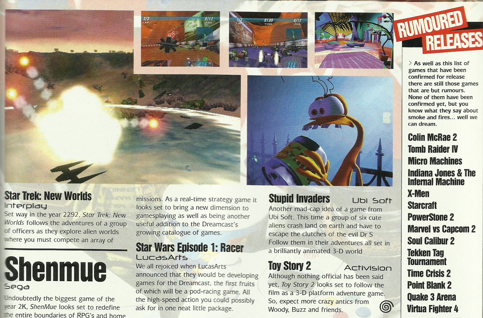Other highlights include a feature on upcoming Codemasters games and an interview with Teruaki Konishi, chief director of Soul Calibur. There is a mention of Megadrive and PC Engine emulation coming to the Dreamcast, and also lots of speculation about Ridge Racer and Tekken Tag Tournament coming to Sega's platform. Reviews include Worms Armageddon, NFL 2K, Marvel Vs Capcom, Sega Worldwide Soccer 2000 and Street Fighter Alpha 3. Here's the video:
