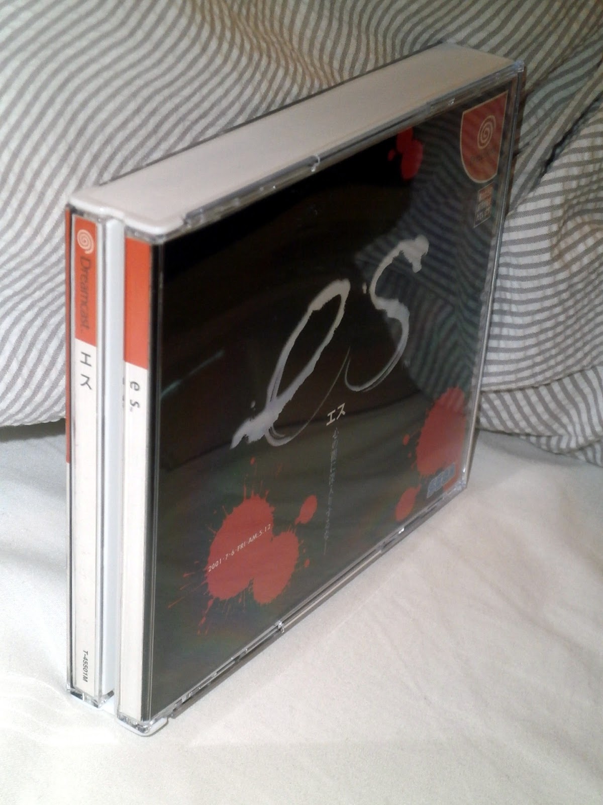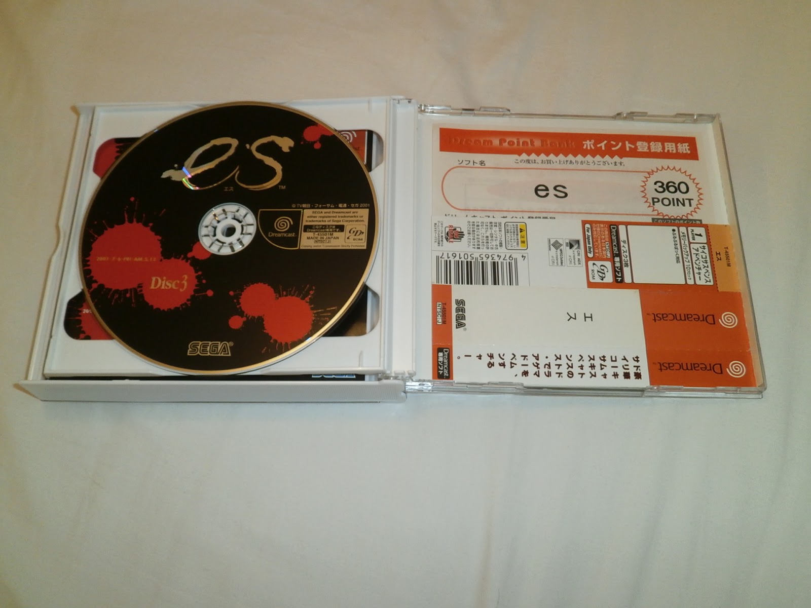The only commonality that I could deduce from these six games as to why they were black while other double cd Dreamcast releases were white was that perhaps games with a darker theme - such as the war simulator Advanced Daisenryaku 2001, the werewolf themed visual novel Interlude, and the blood splattered interactive movie es - could opt to go with a black case instead to match their dark soul. es is also worthy of note, as it has 3 discs, which meant a standard white double case wouldn't hold all of them, which could also indicate a reason for turning black.