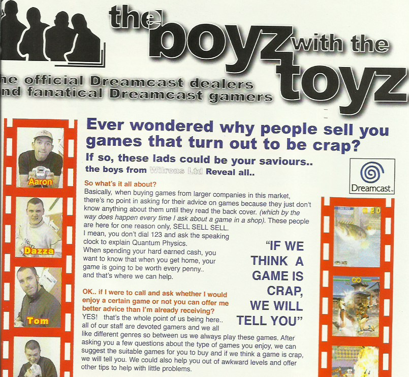 At this point I'd like to apologise for the poor quality scans here. My scanner is on its last legs and only one in ten attempts to scan something actually results in a page being captured. As of now, the thing is perilously close to being drop-kicked out of the nearest window and into a waiting skip, but I thought it was worth battling with this moribund technology in order to show you the advert above. Wilrons purports to be a service where you could ring one of the 'experts' and ask which games they think you should buy. Then they'll offer to send you five Dreamcast titles for the 'bargain' price of £165. Google doesn't seem so evil now, does it?