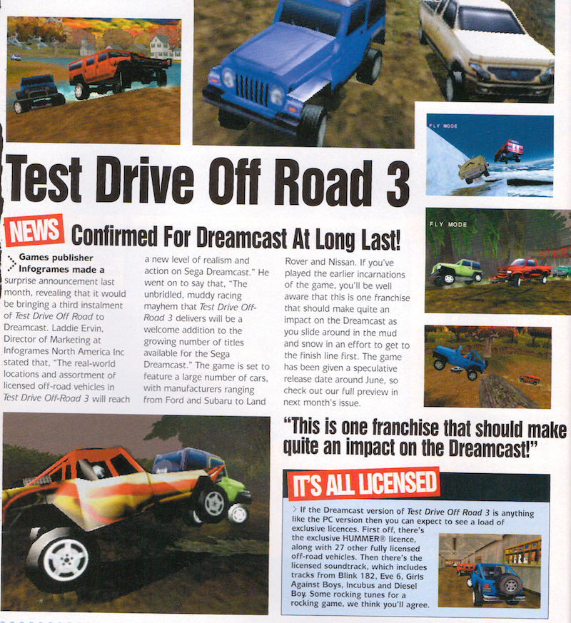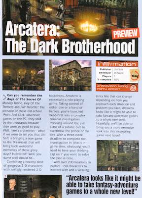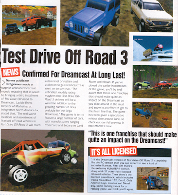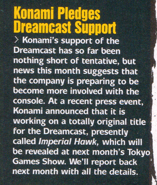 This edition is also a treasure trove for cancelled games, featuring a plethora of abandoned titles for the Dreamcast. Arcatera: The Dark Brotherhood, Buffy the Vampire Slayer, Test Drive Off Road 3, VIP and Austin Powers Mojo Rally are all name checked; and there's the smallest mention of a mysterious Dreamcast exclusive from Konami called Imperial Hawk. Very, very little is known about this Konami Imperial Hawk and it was almost certainly cancelled long before a GD was ever pressed - here's the only other reference to it I can find online. That said, there is another game for the Dreamcast with a similar name. Imperial no Taka: Fighter of Zero (aka Iron Aces) is sometimes listed as Imperial Hawk...but it has no connection to Konami, being developed and published by Global A Entertainment in Japan and Xicat/Infogrames in the west. Could very possibly be the same game, but I thought it was an interesting aside nonetheless.