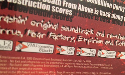 Anyway, I'm in the process of moving house (for about the 8th time in 3 years) and as I was stacking up my beloved Dreamcast games ready to be boxed, I noticed something funny on the back of the Demolition Racer case: