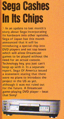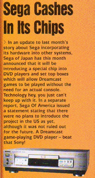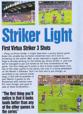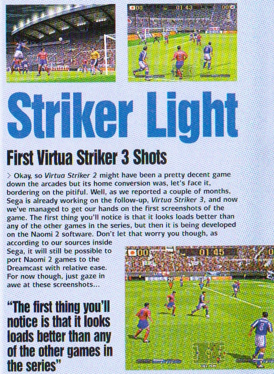 Virtua Striker 3 shots are shown for the first time and there is an interesting story in the Japanese news section that details Sega's plan to incorporate a 'special chip' into DVD players that will allow them to play Dreamcast games. Whether this is a slightly misinformed nod to the ill-fated Pace set top box (read our previous article here for further info on that) is unknown, but if there's any truth at all in the report, it begs the question: why not just add a DVD drive to a Dreamcast rather than try to do it the other way round? It's a moot point now, of course...but it just beggars belief if there's even a modicum of truth in the story. Oh, and you can see our Sega Spud Dive article here.