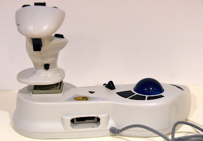A third party stick from recently bankrupt peripheral manufacturer Mad Catz, the Panther is a highly sought after flight stick style controller for the Dreamcast. It isn't exclusively compatible with flight sims and several non-flight games list it as a compatible controller in the manual (Dragon Riders: Chronicles of Pern is one such game; a game that despite its name features exactly zero flying - either dragon-based or otherwise), and I have it on good authority that the thing is pretty tasty when coupled with first person shooters like Quake III: Arena. The most intriguing thing about the Panther is undoubtedly the sparkly blue track ball, and while I have never personally used a Panther several people have told me that it works a charm - and especially so in flight games. Here are a couple of lovely images of the Panther, supplied by DCJY Facebook group member William M. Nash: