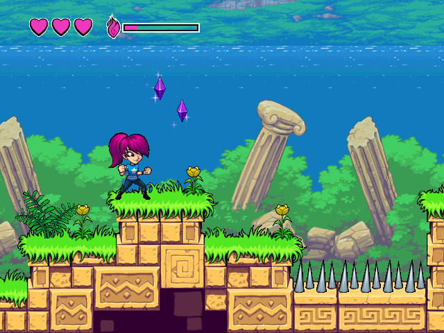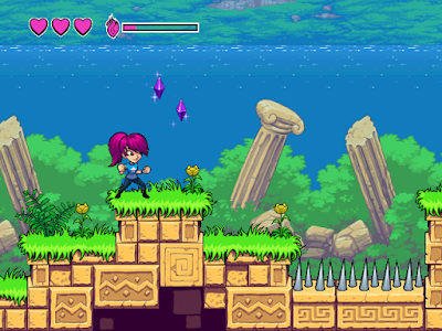 So how does Intrepid Izzy play? In the simplest terms, it's a 2D action platformer, with lovely, hand drawn artwork and fluid, cartoon-like animation (created with custom-made animation software) that gives me vibes of the ever-popular Shantae series. But to just call it an "action platformer" wouldn't be doing the game justice, because Intrepid Izzy is actually pretty deep, dude. While the initial stage is a rather left to right affair, you soon realise that the game has a very non-linear approach to its levels. That's right, Intrepid Izzy's core gameplay is what trendy gaming pundits might refer to as "metroidvania." I'm talking levels within levels, with a focus on light puzzle solving and backtracking. Get that key to open that door there, find a helmet to ride the minecart to a new area, find a new costume to grant you the power to get past an obstacle you passed earlier, and so on.