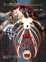 Bit of a weird one this. Rather than pilot a spaceship or helicopter like in most shooters (with the exception of Gunbird 2, where you can pilot a magic carpet), in Trigger Heart Exelica you get to control a Manga schoolgirl in a flying battle-mech outfit. A sexual fantasy fulfilled for many people, I'm sure. It also differs from the rest of the pack in the way that you can fire a sort of grappling-hook thing at enemies in order to 'capture' them. Once captured, you can either use them as a shield or spin them around and throw them back at other enemies. Two birds, one stone. There is a story of sorts that seems to be an integral part of the game - characters are always popping up to chat shit, but seeing as it's all in Japanese I haven't got a clue what it's all about - and even less of a clue as to why, when you destroy them, enemies turn into gold nuggets that then get absorbed by your little character. There are a few different play modes (story, arcade, attract, training etc) and two different characters (with different shooting patterns) to play as, but it's all fairly middle of the road stuff. Trigger Heart is also quite difficult simply because it relies on completely filling the screen with fire at times making it impossible to avoid death, and also has end of level bosses that you have to defeat up to three times before they just fuck off. It's a fairly decent shooter, but nowhere near as good as some.