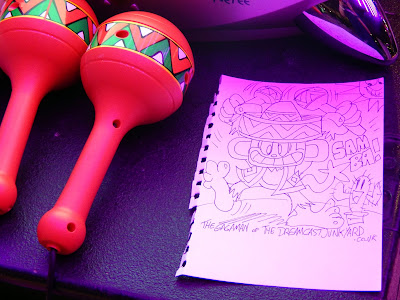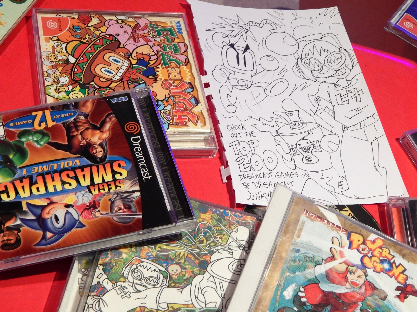 Games we played there included Soul Calibur, Samba De Amigo, Bomberman Online, Chu Chu Rocket, Gigawing, Ikaruga, Ready 2 Rumble Round 2, Guilty Gear X, Capcom vs SNK 2, House of the Dead 2, Virtua Cop 2, Shenmue and more. In between playing games I left behind some doodles, all of which name drop this here Junkyard! Funnily enough someone there recognized me from the old Virtua Tennis with fishing controller video I did yonks ago!