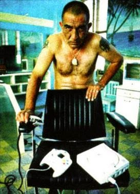 So let's break it down. Robbie Williams' Let Me Entertain You blares, rather appropriately from the speakers as a bunch of fresh-faced Foreign Legion recruits are lead into the barbers studio of some form of military installation. Three barbers await, and are labelled as players one, two and three and then quickly set about engaging in a battle to see who can shave their conscript's head the fastest. Player Two comes out on top as the guard looks on, the younger competitors beaten by the experience of their older adversary. Victorious, the character whom we will henceforth refer to as The Barber, gives a wry smile to the camera as the story comes to a close. It's not a bad advert by any means, and sets the scene perfectly - the Dreamcast was all about multi-player competition after all, what with all the online gubbins. There are some negative points, such as the way no game footage at all was used (and likewise in the other advert from this campaign entitled Buoy) but that's a different story.
